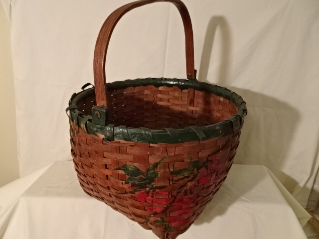 #151 Swing Handle Antique Handmade Basket - green painted flowers - 14" round x 9 1/2" h plus 7" swing handle